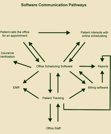 Eppointments is a woman-owned Texas cooperation founded in 1999. As a forward-thinking company, the software was created at the very beginning to be an online scheduling program with patient interaction. Our goal was to reduce the everyday stresses faced by the physician's office personnel, interruptions from daily work tasks and inefficiency, thereby increasing profit. It was also designed to project the physician as one who keeps ahead of their time by offering the latest technology. PhilosophyWe view the patient scheduling process as the heart of any medical practice. This important process has been long overlooked in the development by practice management software. Scheduling is the entry point for the patient. Here initial demographic, insurance and health information are all gathered. Rather than becoming an “adjunct” component thrown in by a billing or EMR program, Eppointments strives to become the leader in scheduling software. Our philosophy is to be the best scheduling software and interface with other software programs who are the leaders in their field. This gives the physician the opportunity to choose which components will work best for them, allowing physicians to move in and out of software components easily and at minimal cost as new needs arise. Taking advantage of the Internet, Eppointments allows convenient and time-saving patient access to the medical practice. We have developed a one-of-a kind scheduling software package that allows patients to complete all of their demographics and health history online. At the physician’s discretion, patients may also make their own appointments online. In addition to our state-of-the art scheduling system, we also have developed an additional software component called Patient Tracking. This component of our software allows the back office staff and physicians to easily see the schedule for the day and which patients have been placed in a room. Below is a diagram of our vision of how scheduling impacts physicians, staff and patients.