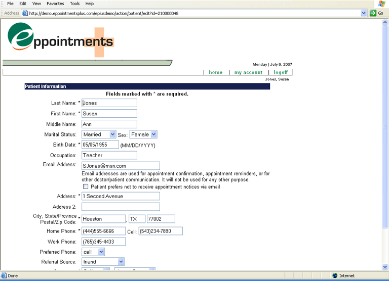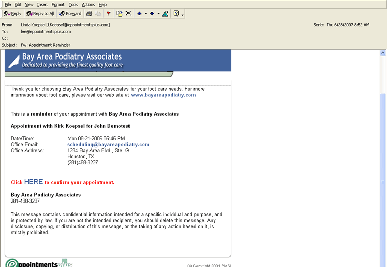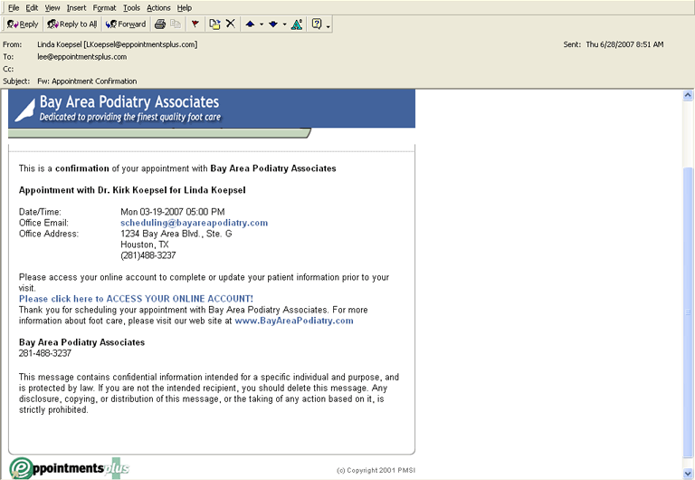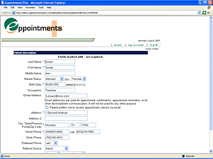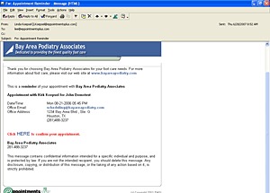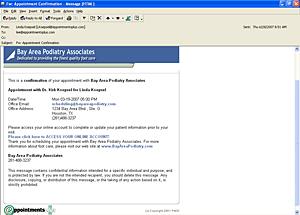 Email MessagesLook forward to no more time consuming telephone calls. Eppointments automatically sends email confirmations to patients with a direct link to let them complete/update their patient information before their appointment. The email reminder includes a link patients can click to confirm their appointment. The confirmation is then indicated on the office schedule. A “thank you” email is generated when the patient checks in, or a “sorry we missed you” email can be sent for no-show appointments. Patient’s email addresses can also be exported for Internet marketing purposes.